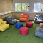 An ideation lounge with bean bags, creative thinking walls, soft and colorful flooring, snack options, and more. A place to think quietly or have a creative and more relaxed meeting with your team. Also doubles as a catering room for larger events.