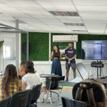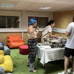 An events space (converted within the coworking space) with a stage, full A/V system (including a speaker system and a large 65″ 4K TV with wireless screen mirroring), and catering setup for fireside chats, pitches and presentations, panel discussions, seminars, and networking events.